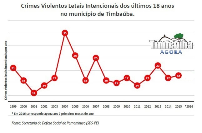 Nos sete primeiros meses do ano de 2015 Timbaúba registrou 11 homicídios, já este ano até o momento já são registrados no município 16 Crimes Violentos Letais Intencionais (CVLI).