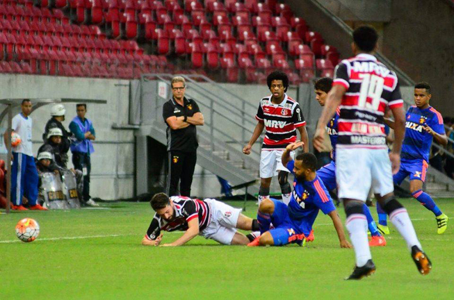 Santa Cruz merecia melhor sorte ao final dos primeiros 45 minutos. De fato, demorou para os tricolores entrarem em campo. O Sport chegou a atingir picos de 61% de posse de bola e havia criado as melhores oportunidades no início do jogo. Mas quando os corais encontraram seu jogo, foram superiores. O gol, que inauguraria o placar, ficou preso na garganta da torcida tricolor por conta da constante ineficiência da equipe nas finalizações. Ao todo, dez foram às oportunidades desperdiçadas pelos comandados de Doriva. Apenas um chute foi direcionado ao gol, e tantos outros - não computados - com furadas dos volantes Uillian Correia e, principalmente, Derley.
